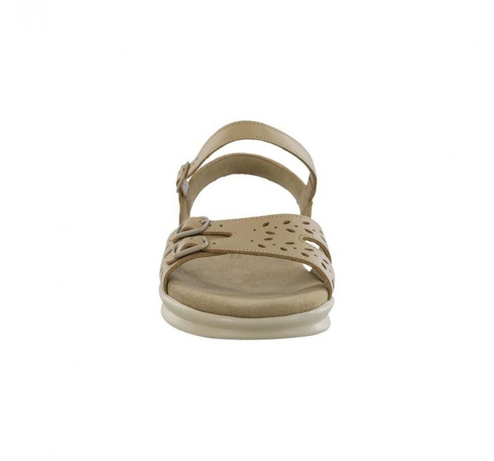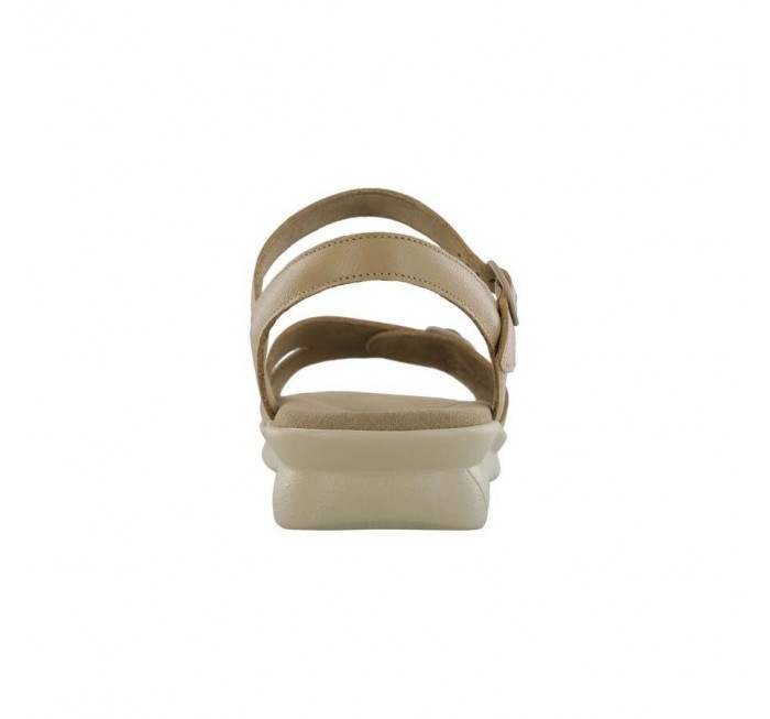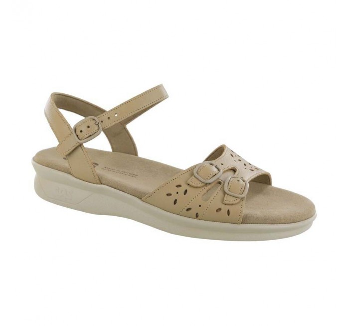 This SAS Duo favorite is your go-to sandal. Three adjustable buckles provide a customized fit, while a plush comfort insole and shock-absorbing sole keep you on your feet all day. The lined leather ankle strap adds stability with each step. Initial fit should allow the foot to settle naturally into the sandal. The front straps and backstrap should fit comfortably on the foot when the ankle strap is adjusted to a comfortable position. Care should be taken to ensure the foot sits inside the edge of the insole, at the back and on the sides.